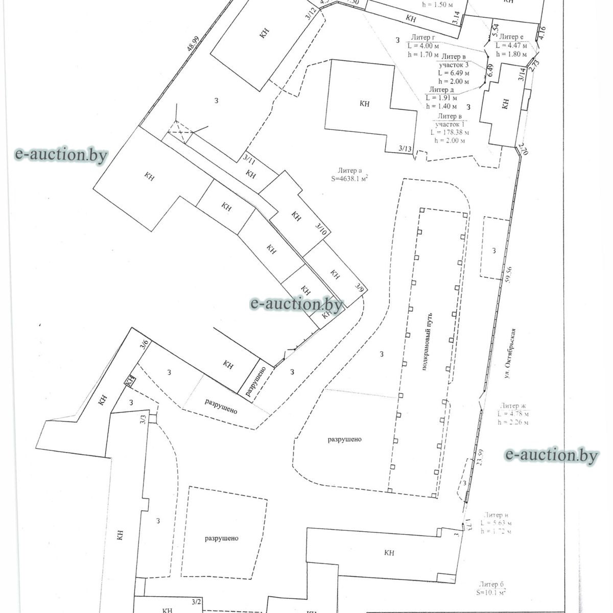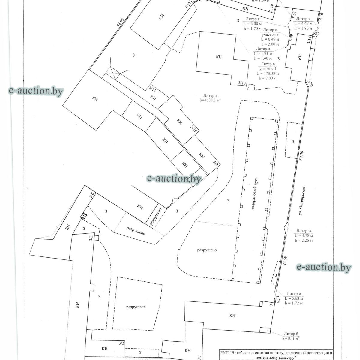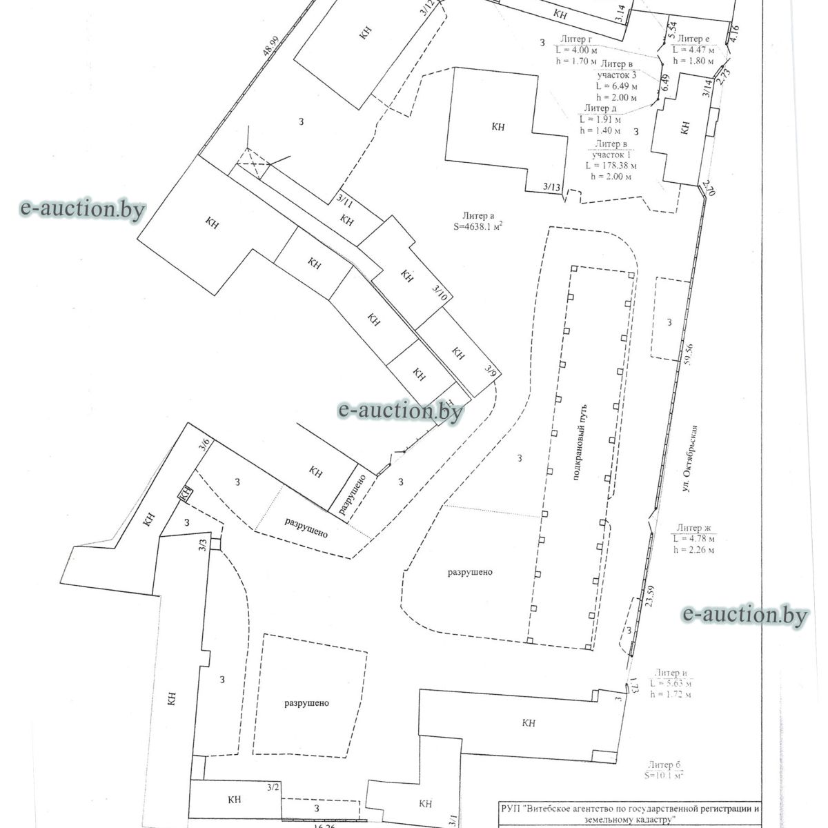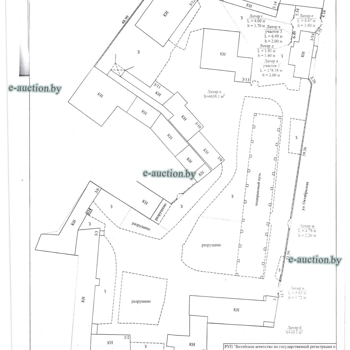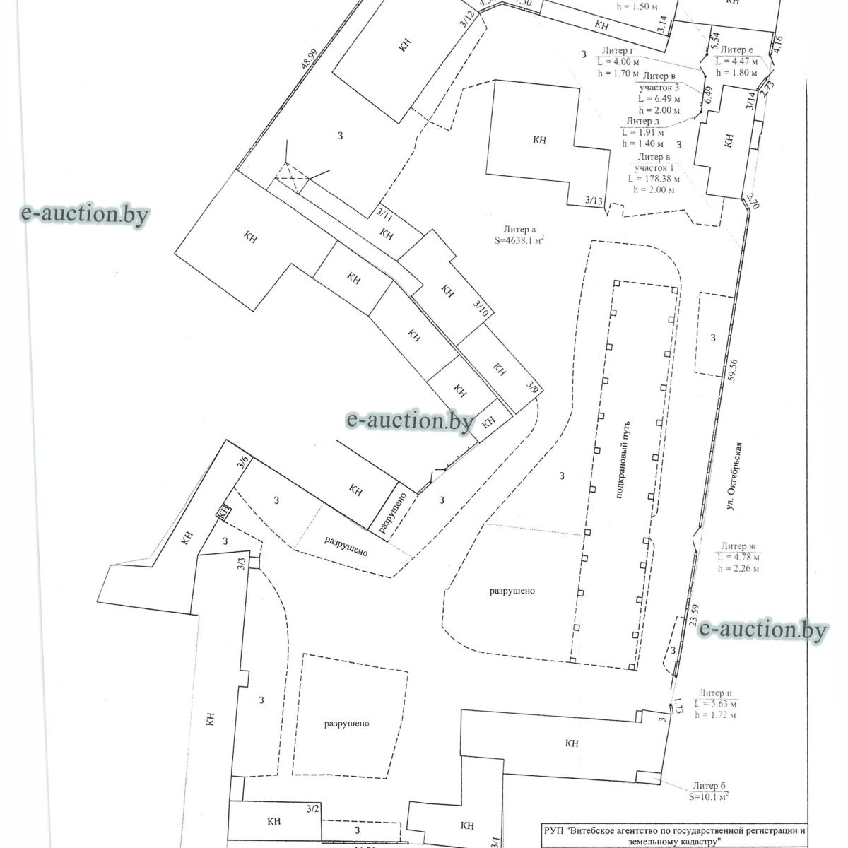 Комплекс недвижимого имущества с правом аренды земельного участка в г. Витебске и многолетним насаждением: 1. Сведения о капитальном строении: Инвентарный номер: 200/C-54443 Адрес (местоположение): Витебская обл., г. Витебск, ул. Октябрьская, 3 Общая площадь (протяженность): 322.6 Наименование: административный корпус Назначение: Здание административно-хозяйственное Составные части и принадлежности: пристройка, проезжая часть, пешеходная часть, ограждение: участок 1, участок 2, участок 3, четверо ворот, калитка 2. Сведения о капитальном строении: Инвентарный номер: 200/C-54455 Адрес (местоположение): Витебская обл., г. Витебск, ул. Октябрьская, 3/3 Общая площадь (протяженность): 714.6 Наименование: Столярная мастерская Назначение: Здание неустановленного назначения Составные части и принадлежности: Подвал, проезжая часть, пешеходная часть, ограждение: участок 1, участок 2, участок 3, калитка, четверо ворот Примечания: Кирпичное здание столярной мастерской 3. Сведения о капитальном строении: Инвентарный номер: 200/C-54444 Адрес (местоположение): Витебская обл., г. Витебск, ул. Октябрьская, 3/ 6 Общая площадь (протяженность): 259.4 Наименование: склады Назначение: Здание специализированное складов, торговых баз, баз материально-технического снабжения, хранилищ Составные части и принадлежности: щитовая, проезжая часть, пешеходная часть, ограждение: участок 1, участок 2, участок 3, четверо ворот, калитка Примечания: одноэтажное кирпичное здание складов с щитовой. 4. Сведения о капитальном строении: Инвентарный номер: 200/C-54441 Адрес (местоположение): Витебская обл., г. Витебск, ул. Октябрьская, 3/1 Общая площадь (протяженность): 173.2 Наименование: Склады Назначение: Здание специализированное складов, торговых баз, баз материально-технического снабжения, хранилищ Составные части и принадлежности: Пристройка, проезжая часть, пешеходная часть, ограждение: участок 1, участок 2, участок 3, калитка, четверо ворот Примечания: Одноэтажное кирпичное здание складов. 5. Сведения о капитальном строении: Инвентарный номер: 200/C-54446 Адрес (местоположение): Витебская обл., г. Витебск, ул. Октябрьская, 3/ 9 Общая площадь (протяженность): 94.1 Наименование: склад цементный Назначение: Здание специализированное складов, торговых баз, баз материально-технического снабжения, хранилищ Составные части и принадлежности: проезжая часть, пешеходная часть, ограждение: участок 1, участок 2, участок 3, четверо ворот, калитка Примечания: одноэтажное кирпичное здание цементного склада. 6. Сведения о капитальном строении: Инвентарный номер: 200/C-54447 Адрес (местоположение): Витебская обл., г. Витебск, ул. Октябрьская, 3/ 12 Общая площадь (протяженность): 336.4 Наименование: гаражи Назначение: Здание специализированное для ремонта и (или) технического обслуживания автомобилей (в том числе автомобильные заправочные, зарядные и газонаполнительные станции) Составные части и принадлежности: проезжая часть, пешеходная часть, ограждение: участок 1, участок 2, участок 3, четверо ворот, калитка Примечания: одноэтажное кирпичное здание гаражей. 7. Сведения о капитальном строении: Инвентарный номер: 200/C-54448 Адрес (местоположение): Витебская обл., г. Витебск, ул. Октябрьская, 3/ 2 Общая площадь (протяженность): 105.1 Наименование: здание мастерской столярной Назначение: Здание неустановленного назначения Составные части и принадлежности: проезжа