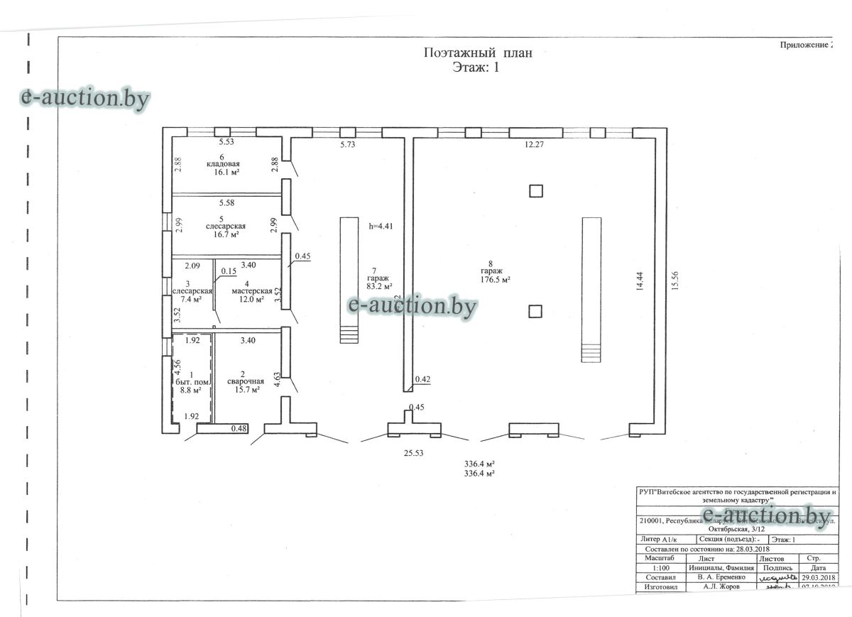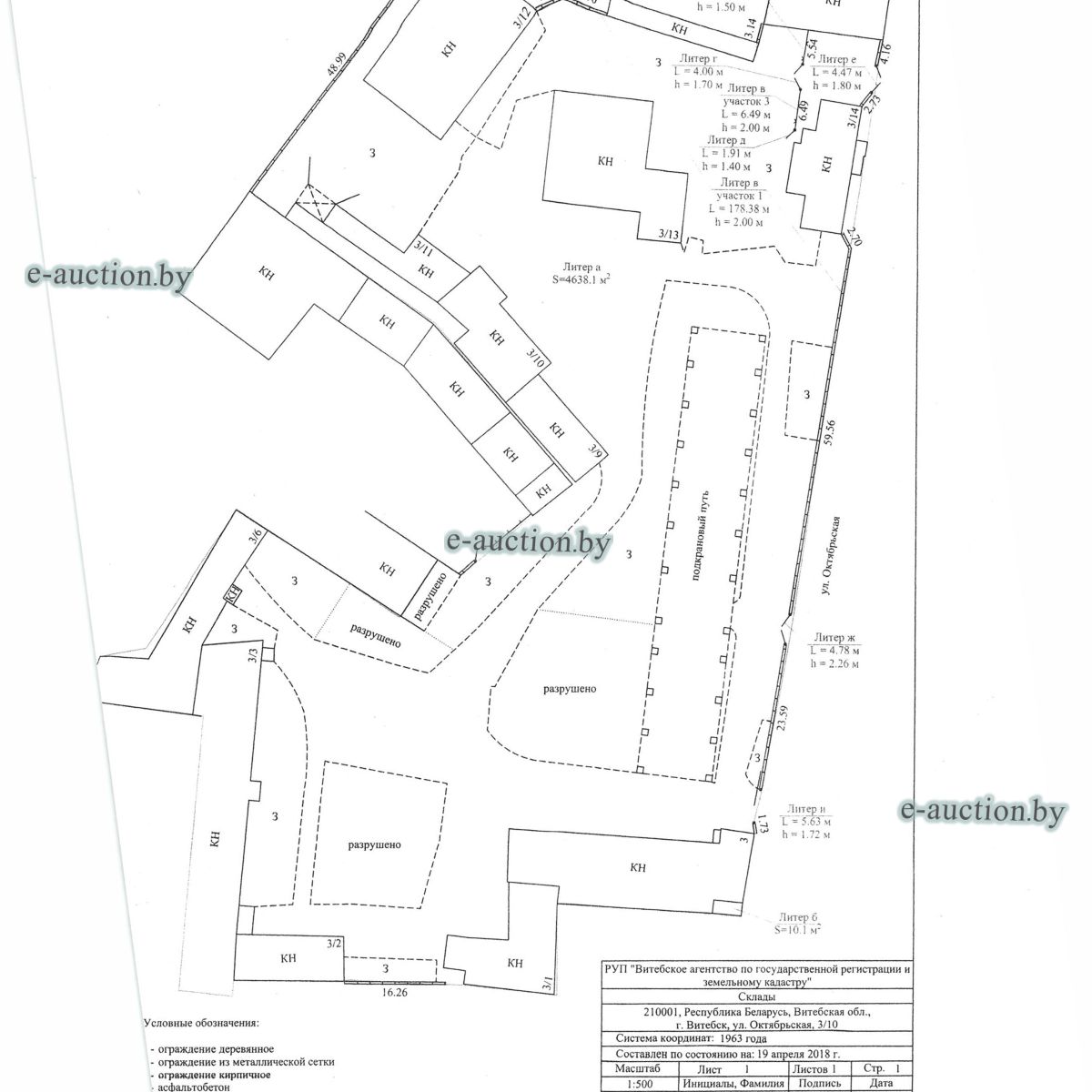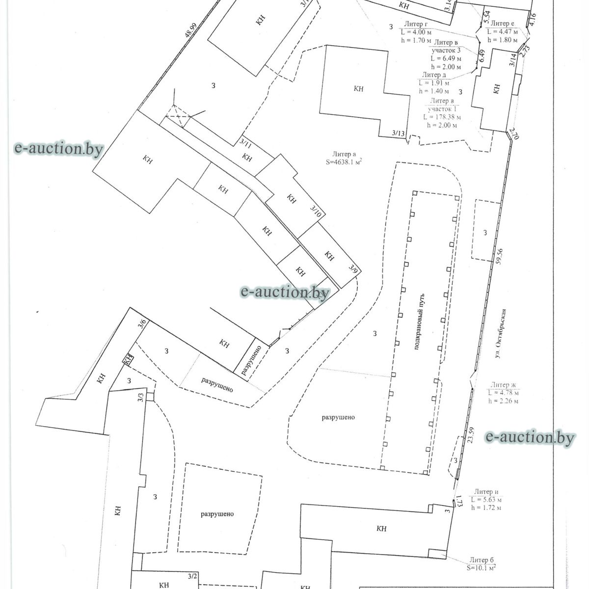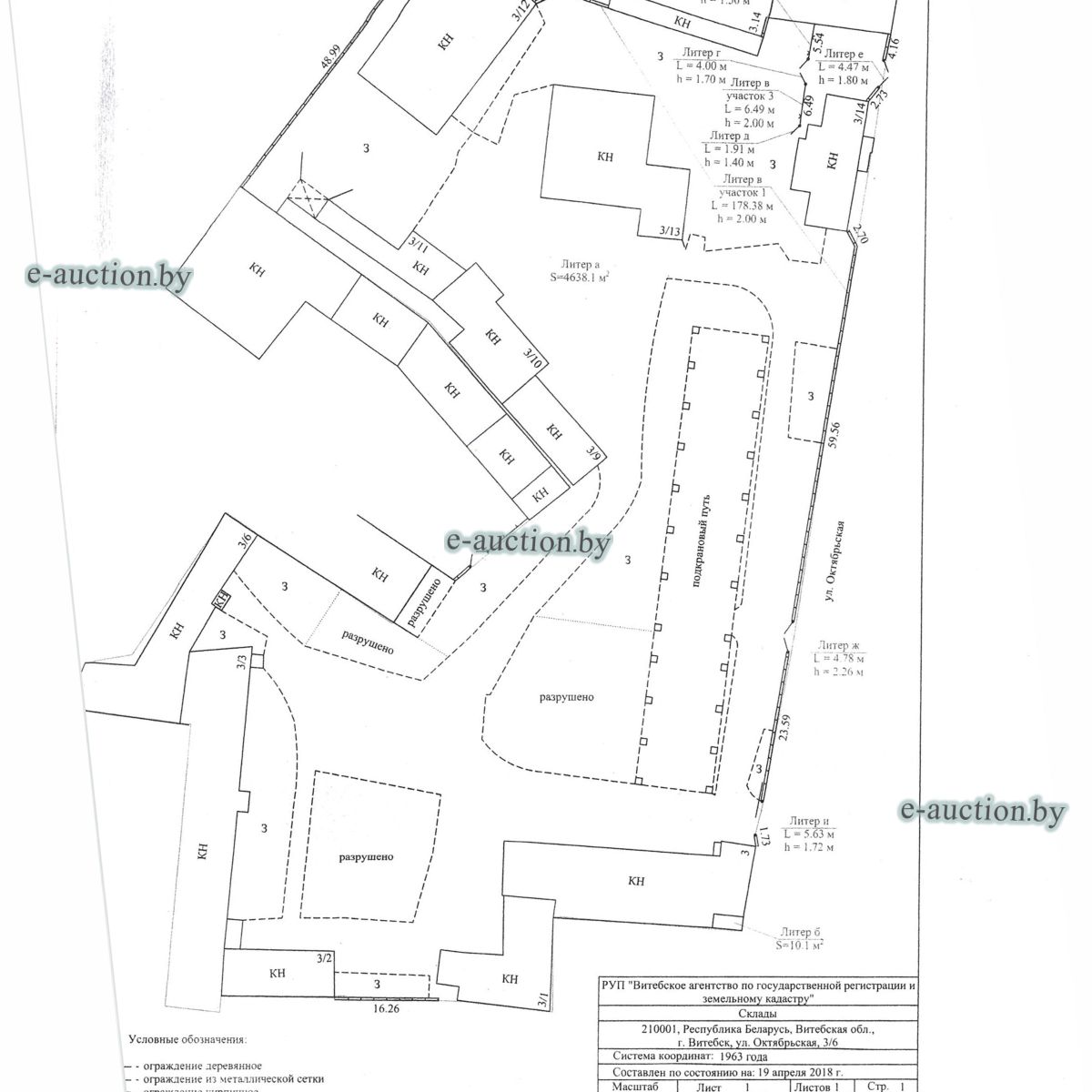 Комплекс недвижимого имущества с правом аренды земельного участка в г. Витебске и многолетним насаждением: 1. Сведения о капитальном строении: Инвентарный номер: 200/C-54443 Адрес (местоположение): Витебская обл., г. Витебск, ул. Октябрьская, 3 Общая площадь (протяженность): 322.6 Наименование: административный корпус Назначение: Здание административно-хозяйственное Составные части и принадлежности: пристройка, проезжая часть, пешеходная часть, ограждение: участок 1, участок 2, участок 3, четверо ворот, калитка 2. Сведения о капитальном строении: Инвентарный номер: 200/C-54455 Адрес (местоположение): Витебская обл., г. Витебск, ул. Октябрьская, 3/3 Общая площадь (протяженность): 714.6 Наименование: Столярная мастерская Назначение: Здание неустановленного назначения Составные части и принадлежности: Подвал, проезжая часть, пешеходная часть, ограждение: участок 1, участок 2, участок 3, калитка, четверо ворот Примечания: Кирпичное здание столярной мастерской 3. Сведения о капитальном строении: Инвентарный номер: 200/C-54444 Адрес (местоположение): Витебская обл., г. Витебск, ул. Октябрьская, 3/ 6 Общая площадь (протяженность): 259.4 Наименование: склады Назначение: Здание специализированное складов, торговых баз, баз материально-технического снабжения, хранилищ Составные части и принадлежности: щитовая, проезжая часть, пешеходная часть, ограждение: участок 1, участок 2, участок 3, четверо ворот, калитка Примечания: одноэтажное кирпичное здание складов с щитовой. 4. Сведения о капитальном строении: Инвентарный номер: 200/C-54441 Адрес (местоположение): Витебская обл., г. Витебск, ул. Октябрьская, 3/1 Общая площадь (протяженность): 173.2 Наименование: Склады Назначение: Здание специализированное складов, торговых баз, баз материально-технического снабжения, хранилищ Составные части и принадлежности: Пристройка, проезжая часть, пешеходная часть, ограждение: участок 1, участок 2, участок 3, калитка, четверо ворот Примечания: Одноэтажное кирпичное здание складов. 5. Сведения о капитальном строении: Инвентарный номер: 200/C-54446 Адрес (местоположение): Витебская обл., г. Витебск, ул. Октябрьская, 3/ 9 Общая площадь (протяженность): 94.1 Наименование: склад цементный Назначение: Здание специализированное складов, торговых баз, баз материально-технического снабжения, хранилищ Составные части и принадлежности: проезжая часть, пешеходная часть, ограждение: участок 1, участок 2, участок 3, четверо ворот, калитка Примечания: одноэтажное кирпичное здание цементного склада. 6. Сведения о капитальном строении: Инвентарный номер: 200/C-54447 Адрес (местоположение): Витебская обл., г. Витебск, ул. Октябрьская, 3/ 12 Общая площадь (протяженность): 336.4 Наименование: гаражи Назначение: Здание специализированное для ремонта и (или) технического обслуживания автомобилей (в том числе автомобильные заправочные, зарядные и газонаполнительные станции) Составные части и принадлежности: проезжая часть, пешеходная часть, ограждение: участок 1, участок 2, участок 3, четверо ворот, калитка Примечания: одноэтажное кирпичное здание гаражей. 7. Сведения о капитальном строении: Инвентарный номер: 200/C-54448 Адрес (местоположение): Витебская обл., г. Витебск, ул. Октябрьская, 3/ 2 Общая площадь (протяженность): 105.1 Наименование: здание мастерской столярной Назначение: Здание неустановленного назначения Составные части и принадлежности: проезжа