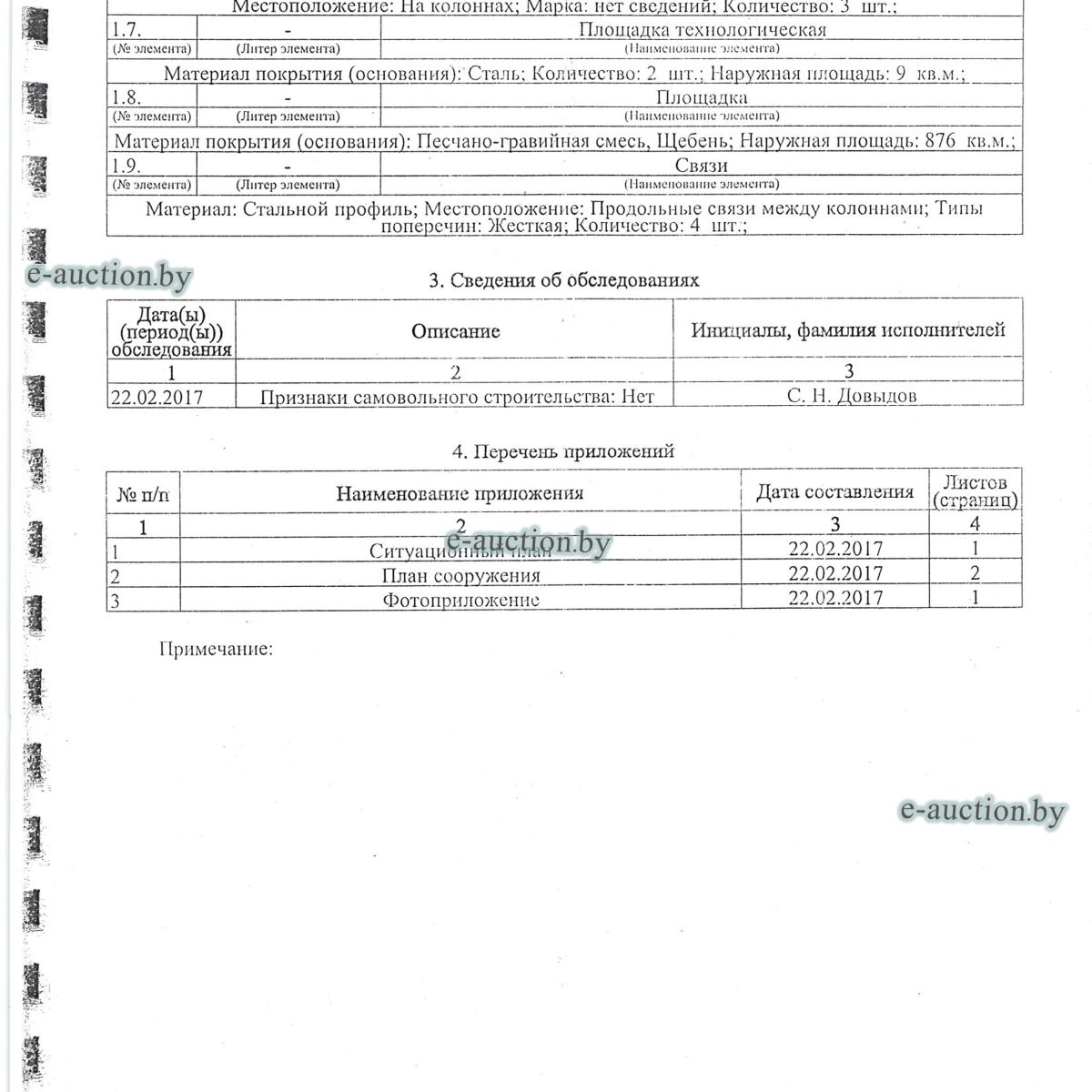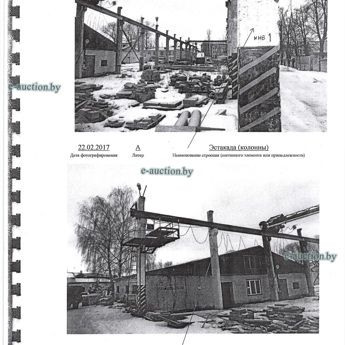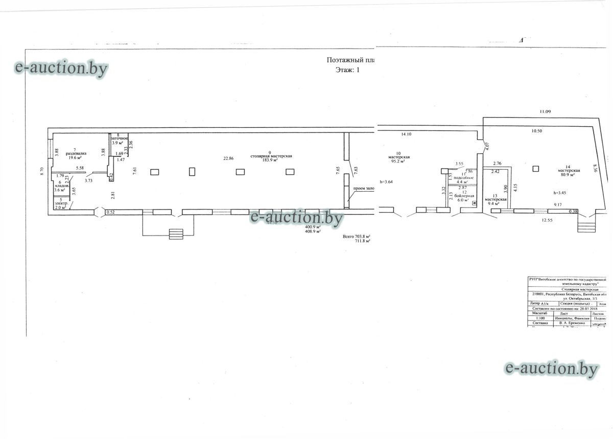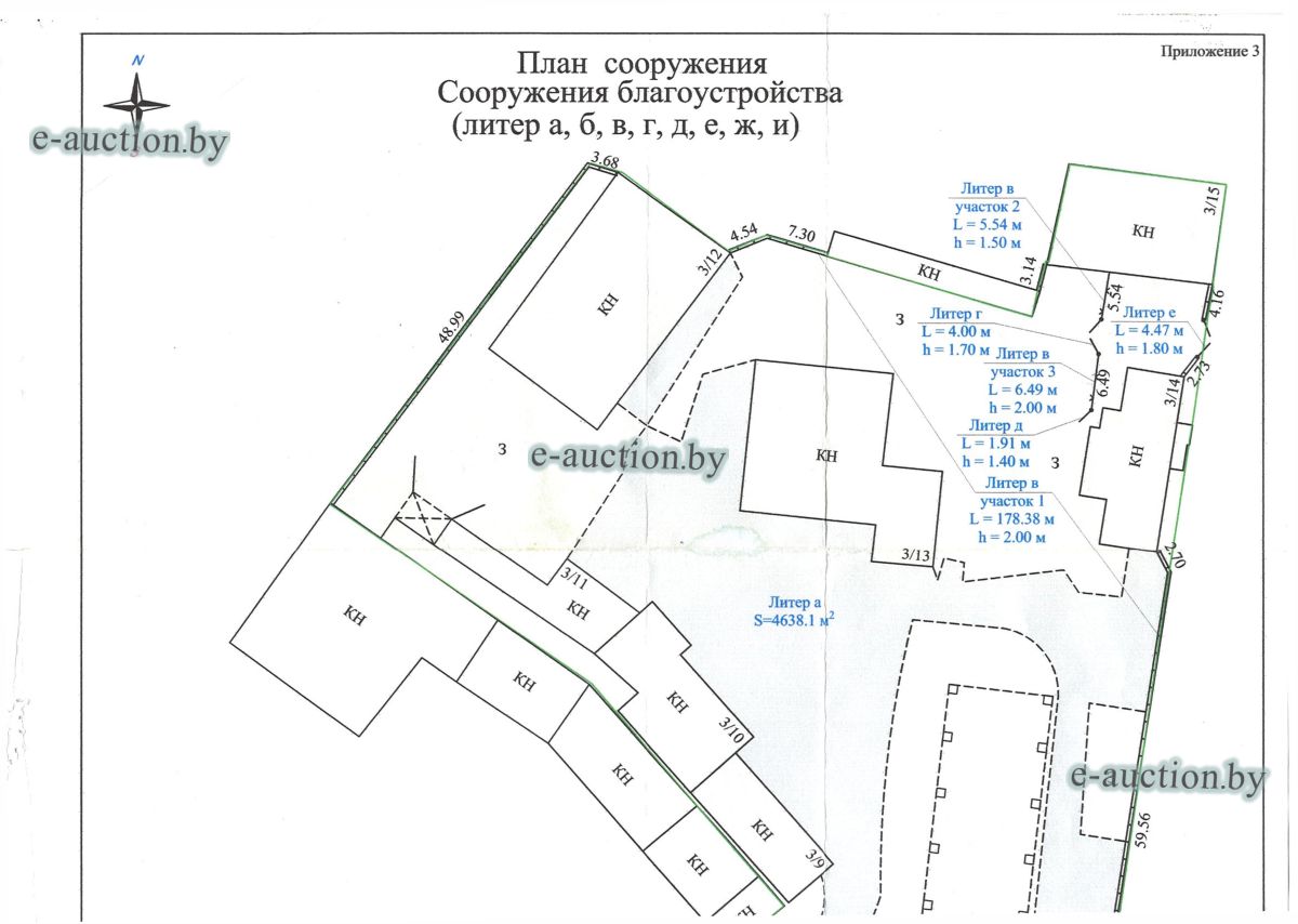Комплекс недвижимого имущества с правом аренды земельного участка в г. Витебске и многолетним насаждением: 1. Сведения о капитальном строении: Инвентарный номер: 200/C-54443 Адрес (местоположение): Витебская обл., г. Витебск, ул. Октябрьская, 3 Общая площадь (протяженность): 322.6 Наименование: административный корпус Назначение: Здание административно-хозяйственное Составные части и принадлежности: пристройка, проезжая часть, пешеходная часть, ограждение: участок 1, участок 2, участок 3, четверо ворот, калитка 2. Сведения о капитальном строении: Инвентарный номер: 200/C-54455 Адрес (местоположение): Витебская обл., г. Витебск, ул. Октябрьская, 3/3 Общая площадь (протяженность): 714.6 Наименование: Столярная мастерская Назначение: Здание неустановленного назначения Составные части и принадлежности: Подвал, проезжая часть, пешеходная часть, ограждение: участок 1, участок 2, участок 3, калитка, четверо ворот Примечания: Кирпичное здание столярной мастерской 3. Сведения о капитальном строении: Инвентарный номер: 200/C-54444 Адрес (местоположение): Витебская обл., г. Витебск, ул. Октябрьская, 3/ 6 Общая площадь (протяженность): 259.4 Наименование: склады Назначение: Здание специализированное складов, торговых баз, баз материально-технического снабжения, хранилищ Составные части и принадлежности: щитовая, проезжая часть, пешеходная часть, ограждение: участок 1, участок 2, участок 3, четверо ворот, калитка Примечания: одноэтажное кирпичное здание складов с щитовой. 4. Сведения о капитальном строении: Инвентарный номер: 200/C-54441 Адрес (местоположение): Витебская обл., г. Витебск, ул. Октябрьская, 3/1 Общая площадь (протяженность): 173.2 Наименование: Склады Назначение: Здание специализированное складов, торговых баз, баз материально-технического снабжения, хранилищ Составные части и принадлежности: Пристройка, проезжая часть, пешеходная часть, ограждение: участок 1, участок 2, участок 3, калитка, четверо ворот Примечания: Одноэтажное кирпичное здание складов. 5. Сведения о капитальном строении: Инвентарный номер: 200/C-54446 Адрес (местоположение): Витебская обл., г. Витебск, ул. Октябрьская, 3/ 9 Общая площадь (протяженность): 94.1 Наименование: склад цементный Назначение: Здание специализированное складов, торговых баз, баз материально-технического снабжения, хранилищ Составные части и принадлежности: проезжая часть, пешеходная часть, ограждение: участок 1, участок 2, участок 3, четверо ворот, калитка Примечания: одноэтажное кирпичное здание цементного склада. 6. Сведения о капитальном строении: Инвентарный номер: 200/C-54447 Адрес (местоположение): Витебская обл., г. Витебск, ул. Октябрьская, 3/ 12 Общая площадь (протяженность): 336.4 Наименование: гаражи Назначение: Здание специализированное для ремонта и (или) технического обслуживания автомобилей (в том числе автомобильные заправочные, зарядные и газонаполнительные станции) Составные части и принадлежности: проезжая часть, пешеходная часть, ограждение: участок 1, участок 2, участок 3, четверо ворот, калитка Примечания: одноэтажное кирпичное здание гаражей. 7. Сведения о капитальном строении: Инвентарный номер: 200/C-54448 Адрес (местоположение): Витебская обл., г. Витебск, ул. Октябрьская, 3/ 2 Общая площадь (протяженность): 105.1 Наименование: здание мастерской столярной Назначение: Здание неустановленного назначения Составные части и принадлежности: проезжа