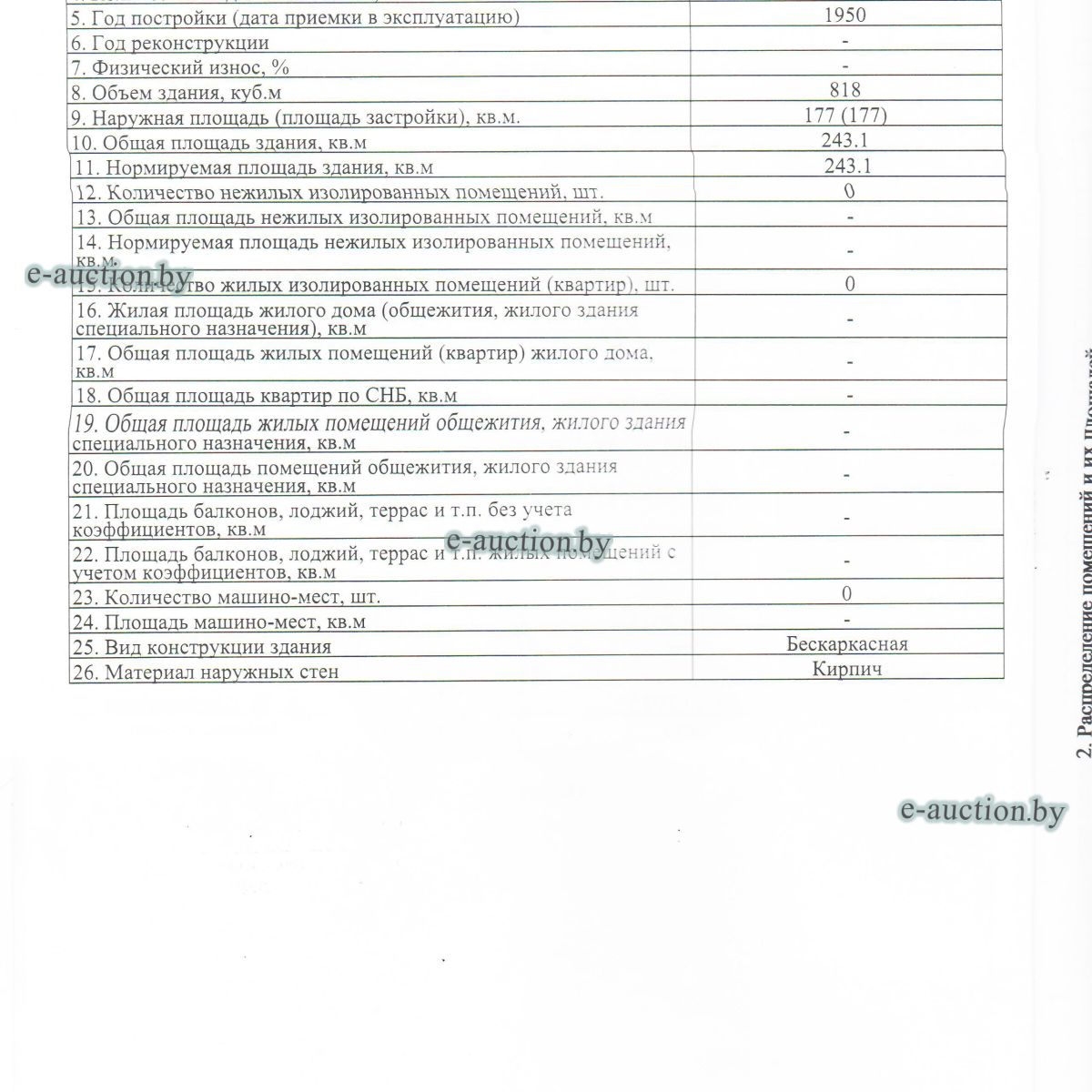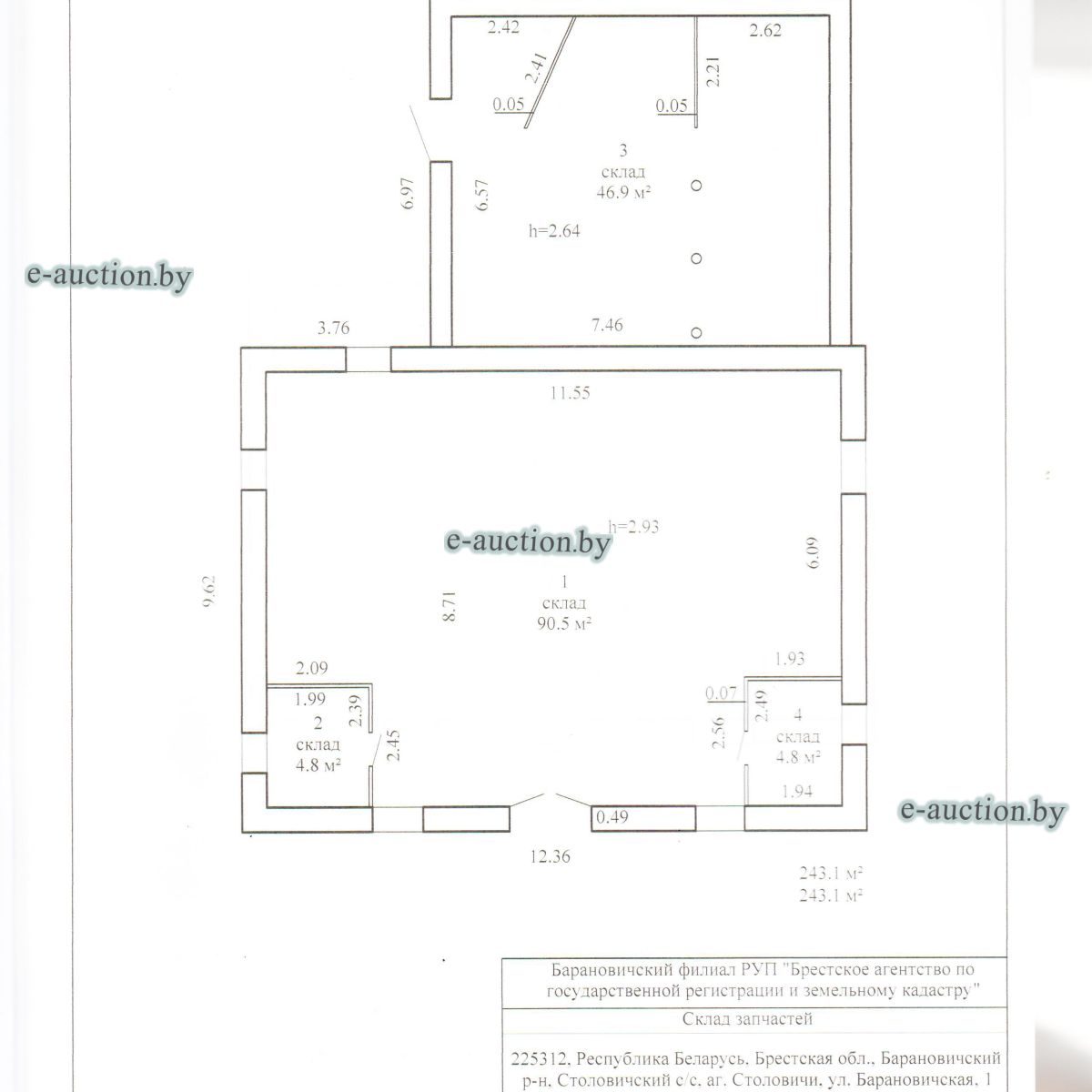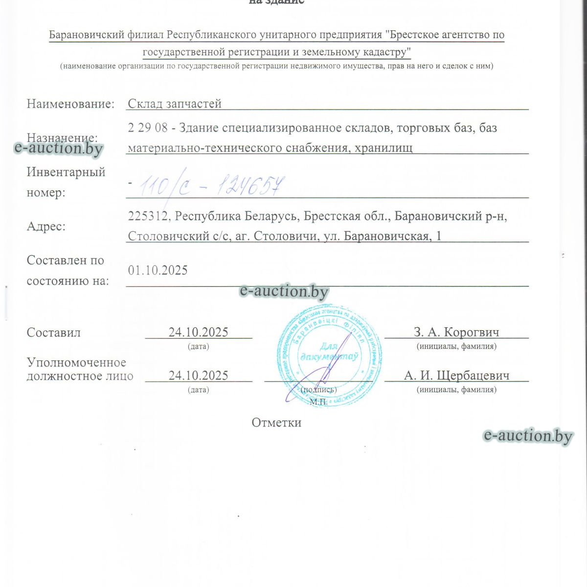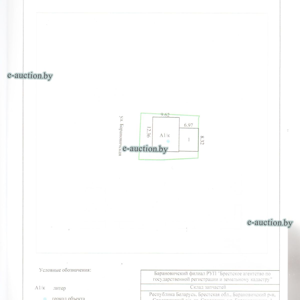 Сведения о капитальном строении из ЕГРНИ: Инвентарный номер: 110/C-124657 Адрес (местоположение): Брестская обл., Барановичский р-н, Столовичский с/с, аг. Столовичи, ул. Барановичская, 1 Общая площадь (протяженность): 243.1 Наименование: Склад запчастей Назначение: Здание специализированное складов, торговых баз, баз материально-технического снабжения, хранилищ Составные части и принадлежности: Этаж цокольный, пристройка. Право собственности: Открытое акционерное общество "СтоловичиАгро". Расположено на земельном участке с кад. №120489004101000554 площадью 0.0341 га (Право постоянного пользования). Цена указана с НДС. |