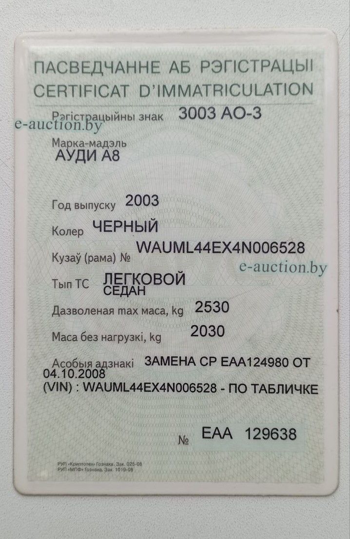 Рег. знак 3003 АО-3 VIN: WAUML44EX4N006528 (указан в соответствии с предоставленными документами) Отсутствует доступ в подкапотное пространство. Повреждения крыши и заднего стекла в результате падения дерева. Имеются повреждения лакокрасочного покрытия, коррозия. Загрязнения салона. Длительное время не эксплуатируется. При инструментальном контроле, диагностике, разборке возможно выявление скрытых дефектов и неисправностей. |