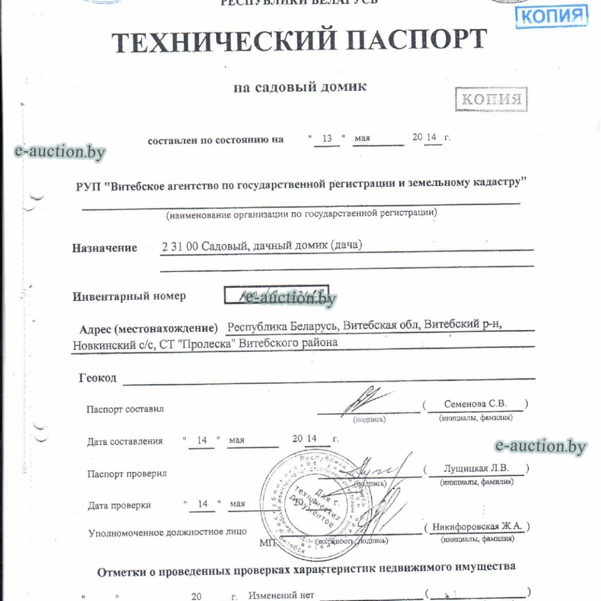 | Местоположение имущества | Витебская область, Витебский р-н, Новкинский с/с, садоводческое товарищество «Пролеска» |