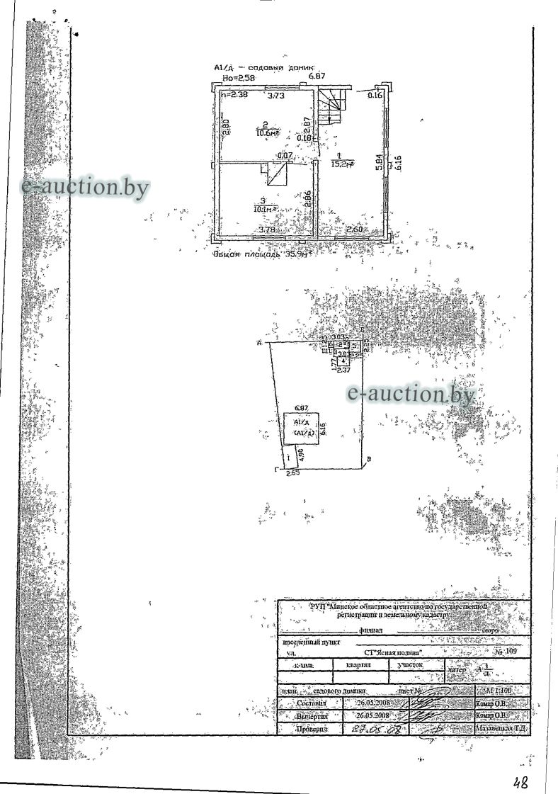 Лот представляет собой объект недвижимости в составе капитального строения и земельного участка Сведения о капитальном строении из ЕГРНИ: Наименование: Садовый домик; Назначение: Садовый, дачный домик (дача); Составные части и принадлежности: Одноэтажный дощатый садовый домик с погребом (А1/д), гаражом 1, баней 2, холодной присторойкой 3, навесом 4, сараем 5, уборной 6; Право собственности: Гражданин Республики Беларусь. Сведения о земельном участке из ЕГРНИ: Кадастровый номер: 623681700015000043; Адрес (местоположение): Минская обл., Минский р-н, Ждановичский с/с, СТ Ясная поляна, д. 109; Площадь (га): 0.0423; Целевое назначение земельного участка: Садоводство в садоводческом товариществе "Ясная поляна"; Назначение земельного участка в соответствии с единой классификацией назначения объектов недвижимого имущества: Земельный участок для коллективного садоводства; Право собственности: Гражданин Республики Беларусь. Обращаем ваше внимание: в соответствии с положением о садоводческих товариществах, утверждённым Указом Президента Республики Беларусь № 155 от 30.05.2023, членами товарищества могут быть граждане Республики Беларусь, иностранные граждане и лица без гражданства, имеющие в границах товарищества на праве частной собственности, пожизненного наследуемого владения или аренды земельные участки (доли в праве на них), предоставленные для коллективного садоводства. |