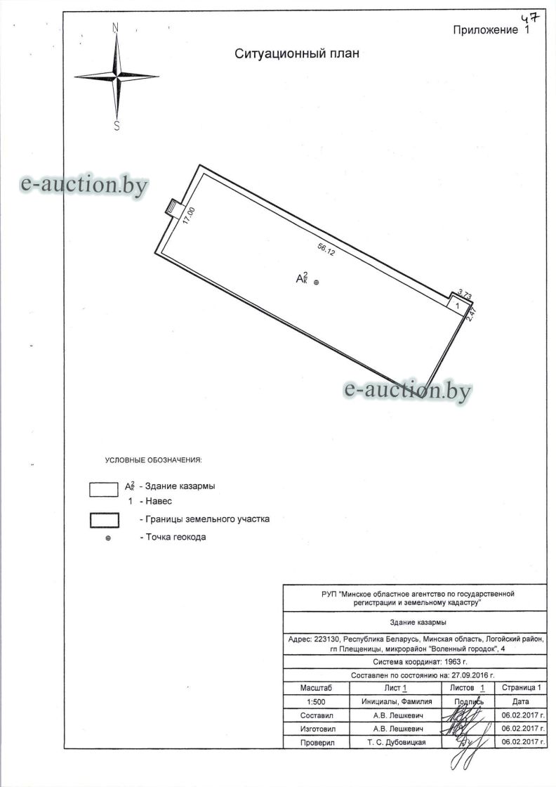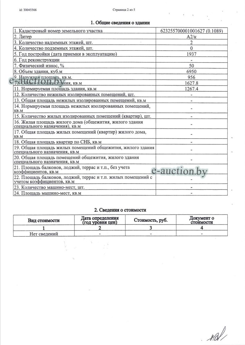 Сведения о капитальном строении из ЕГРНИ: Общая площадь (протяженность): 1606.6; Наименование: Здание казармы 4/1; Назначение: Здание специализированное иного назначения; Составные части и принадлежности: Двухэтажное кирпичное здание казармы 4/1 с двумя террасами 1,2; Право собственности: Гражданин Республики Беларусь. *по данным технического паспорта общая площадь составляет 1627,8 кв.м. Право хозяйственного ведения: Торговое частное унитарное предприятие "САНТИКА". Кадастровый номер земельного участка, на котором расположено капитальное строение: 623255700001001627, площадью 0.1089 га (Право аренды, Торговое частное унитарное предприятие "САНТИКА"); Назначение земельного участка в соответствии с единой классификацией назначения объектов недвижимого имущества: Земельный участок для размещения объектов иного назначения. |