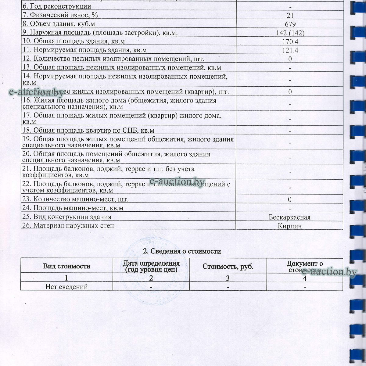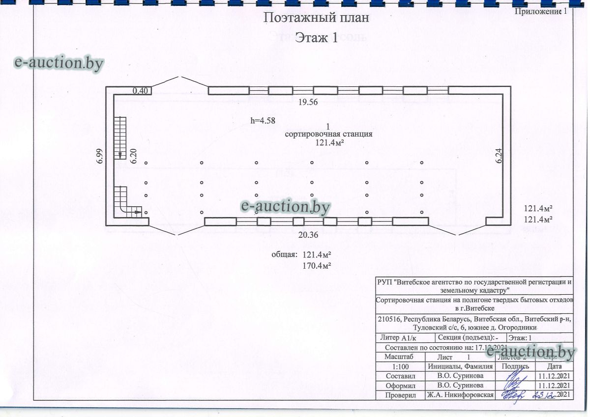 Лот представляет собой объект недвижимости в составе капитального строения и земельного участка. Сведения о капитальном строении из ЕГРНИ: Наименование: сортировочная станция на полигоне твердых бытовых отходов в г. Витебске; Назначение: здание специализированное коммунального хозяйства; Составные части и принадлежности: покрытие, три подпорные стены, асбестовая труба. Принадлежит должнику на праве собственности. Сведения о земельном участке из ЕГРНИ: Кадастровый номер: 221200000001000236; Площадь (га): 0.3850; Целевое назначение земельного участка: земельный участок для строительства и обслуживания сортировочной станции по объекту "Сортировочная станция на полигоне твердых бытовых отходов в г. Витебске"; Назначение земельного участка в соответствии с единой классификацией назначения объектов недвижимого имущества: земельный участок для размещения объектов иного назначения. Ограничения (обременения) прав на земельные участки, расположенные в охранных зонах электрических сетей напряжением до 1000 вольт, площадь 0.0471 га. Принадлежит должнику на праве собственности. |