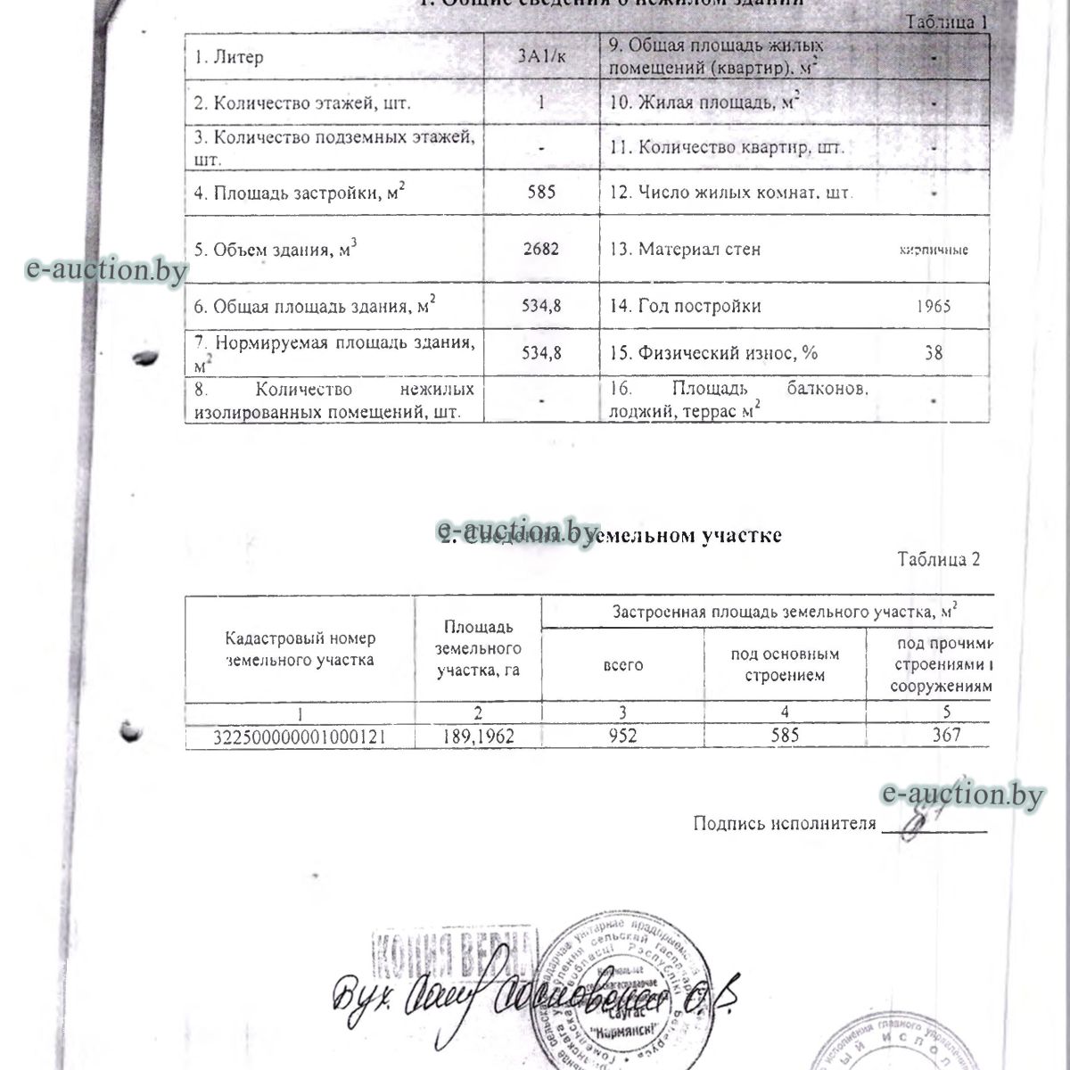 Сведения о капитальном строении: Наименование: Здание зерносклада Назначение: Здание специализированное складов, торговых баз, баз материально-технического снабжения, хранилищ Составные части и принадлежности: Одноэтажное кирпичное здание зерносклада с двумя навесами Право хозяйственного ведения Сведения о земельном участке: Кадастровый номер земельного участка, на котором расположено капитальное строение: 322500000001000121 Отдельный земельный участок для обслуживания строения не выделен. |