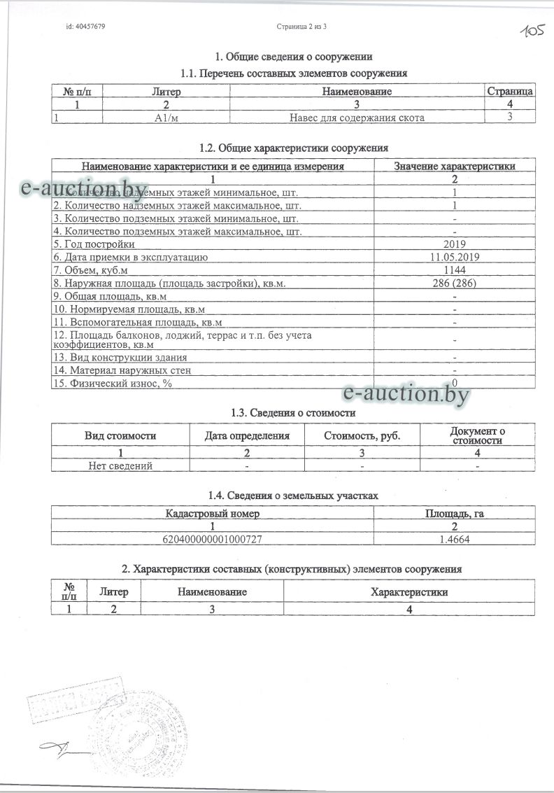 Сведения о капитальном строении из ЕГРНИ: Наименование: Навес для содержания скота; Назначение: Сооружение неустановленного назначения; Составные части и принадлежности: А1/м-Навес для содержания скота; Принадлежит должнику на праве собственности. Кадастровый номер земельного участка, на котором расположено капитальное строение: 620400000001000727, площадью 1.4664 га (Право аренды); Целевое назначение земельного участка: Земельный участок для иных сельскохозяйственных целей (обслуживания мясоперерабатывающего комплекса); Назначение земельного участка в соответствии с единой классификацией назначения объектов недвижимого имущества: Земельный участок для иных сельскохозяйственных целей; Отдельный земельный участок для обслуживания капитального строения не выделен. |