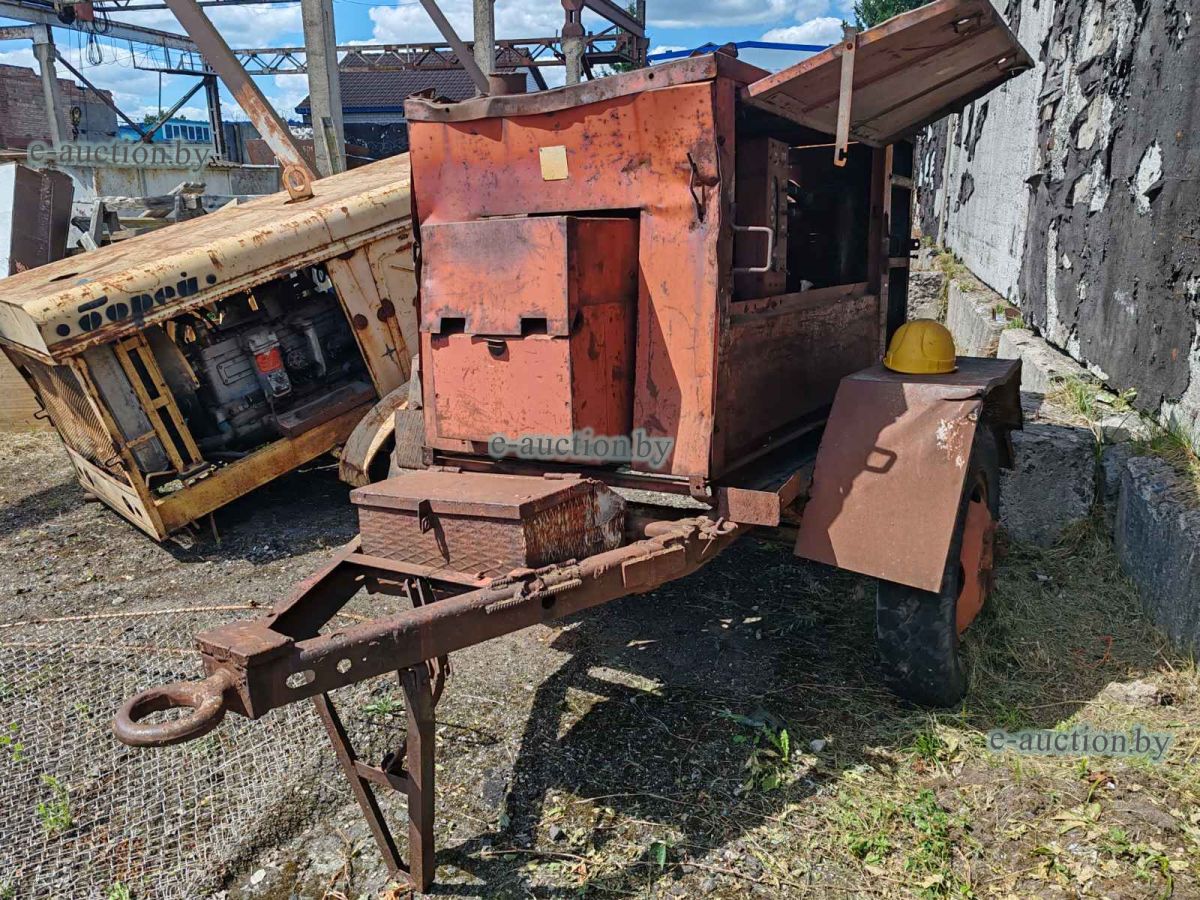 Автономный буксируемый источник электропитания предназначен для ручной дуговой сварки, резки, наплавки металлов постоянным током и прочих нужд. Технические характеристики: двигатель - ЗМЗ 403 (Волга), топливо - бензин, номинальный сварочный ток - 315(А). Инв. №884. |